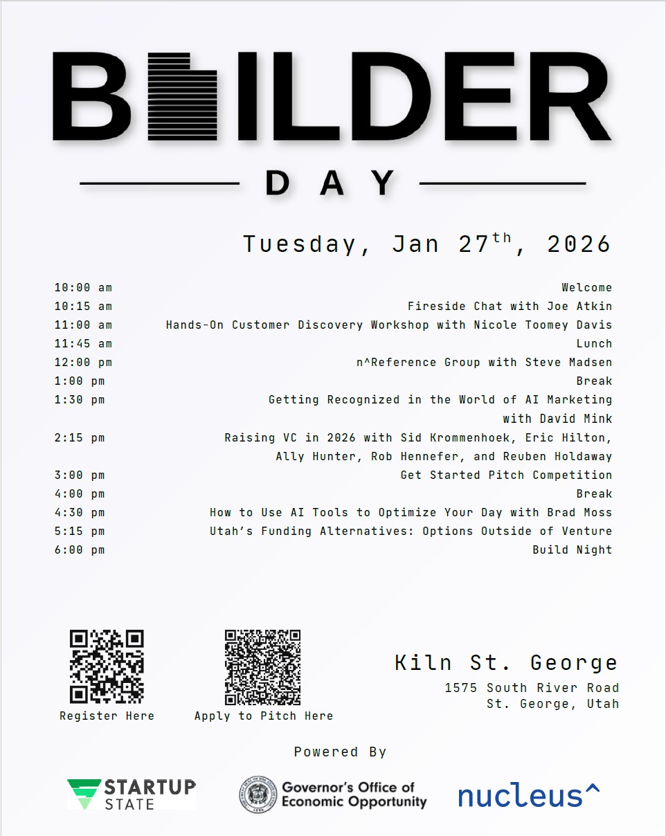 Utah’s GOEO and Nucleus Institute are sponsoring an exciting Builder Day for the Southern Utah Startup Community. It will be Tues, 1/27/26 at Kiln, St. George.